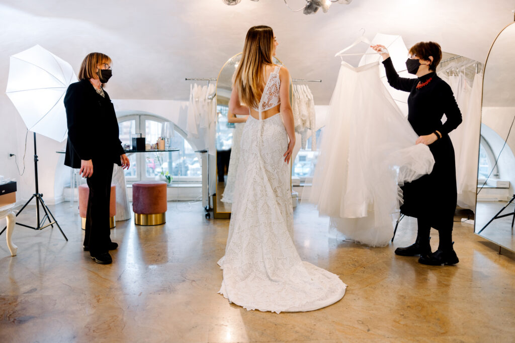A questo primo appuntamento seguiranno altre prove, da valutare insieme in base a tantissimi fattori come tempistiche, esigenze, modello dell’abito, necessità.